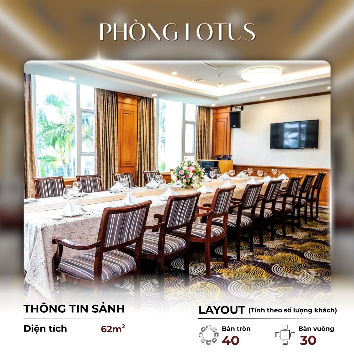 Nếu Quý khách đang tìm kiếm một không gian riêng tư – ấm áp – lịch sự cho buổi tiệc hay hội nghị dưới 50 khách, Lotus sẽ là lựa chọn hài hòa giữa công năng và cảm xúc.